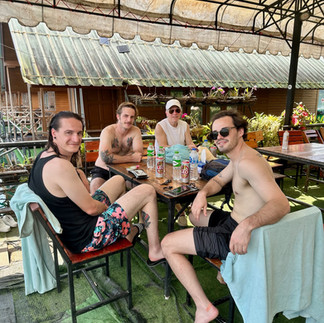 We'd heard wonderful things about Chiang Mai. Though relatively small, about the size of Richmond, it's rated as one of the best cities in Asia. Jamie lived there for a year, so he was familiar with it. Martha had us booked at the Art Mai Gallery Nimman Hotel, a smaller boutique hotel in a cute neighborhood, a little more modern with lots of character. Driving in we were impressed with the shops and restaurants. Trendy in a Thai sort of way with plenty of tourists. Only two rooms, so Jamie & Patrick had to share. The hotel had a rooftop pool, which the boys used. It also had a "speak-easy" type bar on an upper floor; dark and mysterious(!), where we stopped. Starving, we then just popped into a restaurant across the street.
